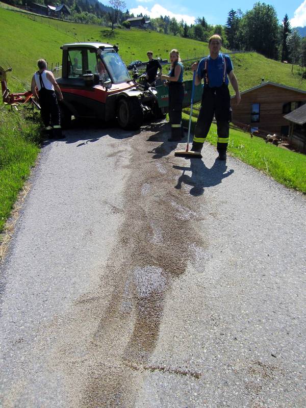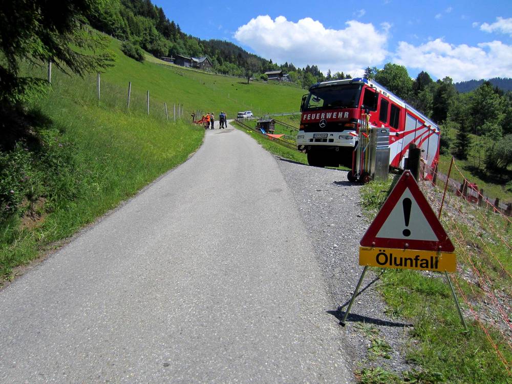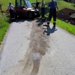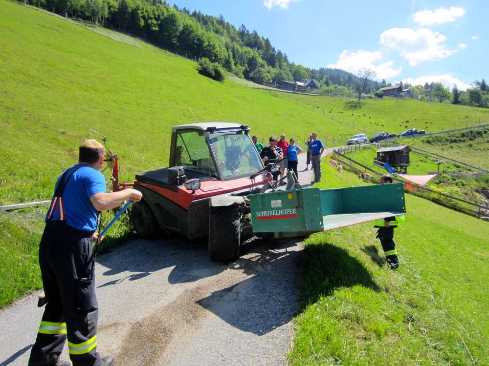 Situation: Am Mittwoch Morgen stürzte ein landwirtschaftliches Fahrzeug bei Mäharbeiten ca. 50 Meter auf die darunterliegende Straße ab. Der verletzte Fahrzeugführer wurde beim Eintreffen der OF Zwischenwasser bereits durch die First Responder Gruppe Dafins versorgt und dem Rettungsdienst übergeben. Die Vorderachse des Fahrzeuges war schwer beschädigt wodurch Öl austrat. Die Unfallstelle wurde von den Kameraden abgesichert und das ausgetretene Öl mit Bindemittel gebunden. Zudem wurde das beschädigte Fahrzeug zum Abtransport verladen und die Anbaugeräte weggeräumt.