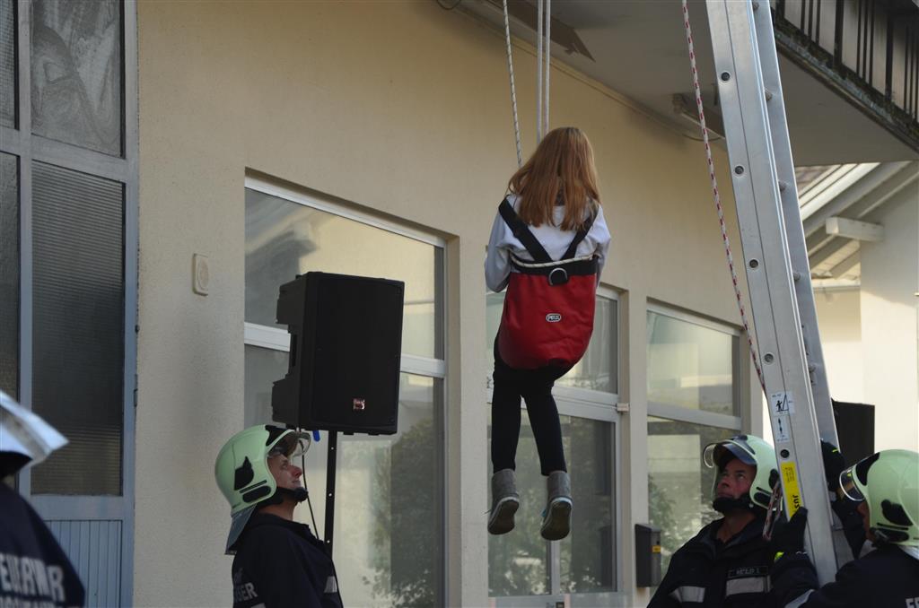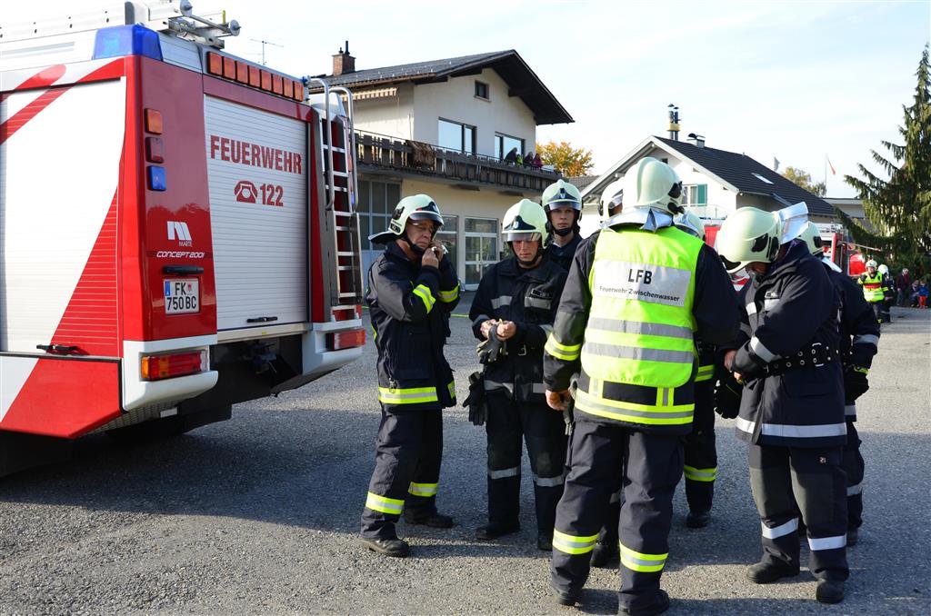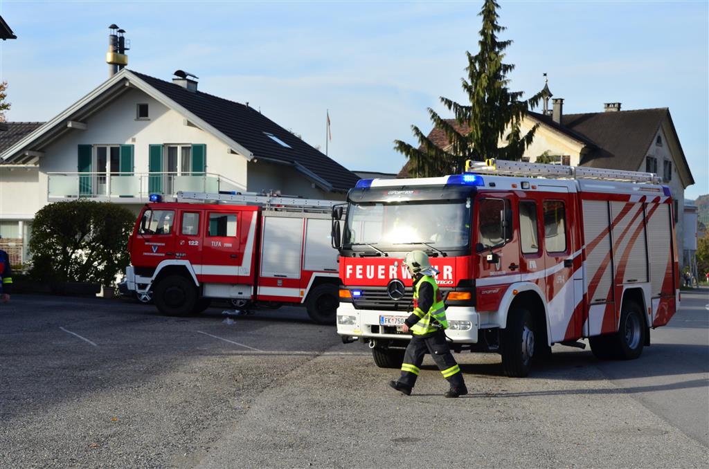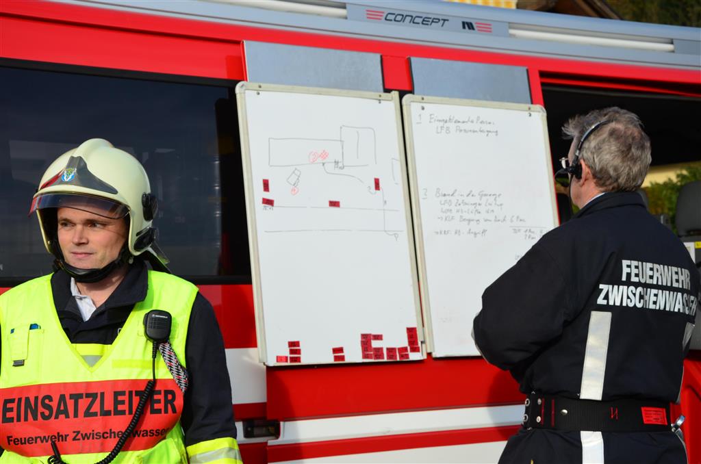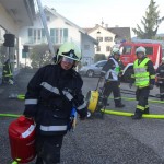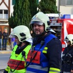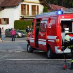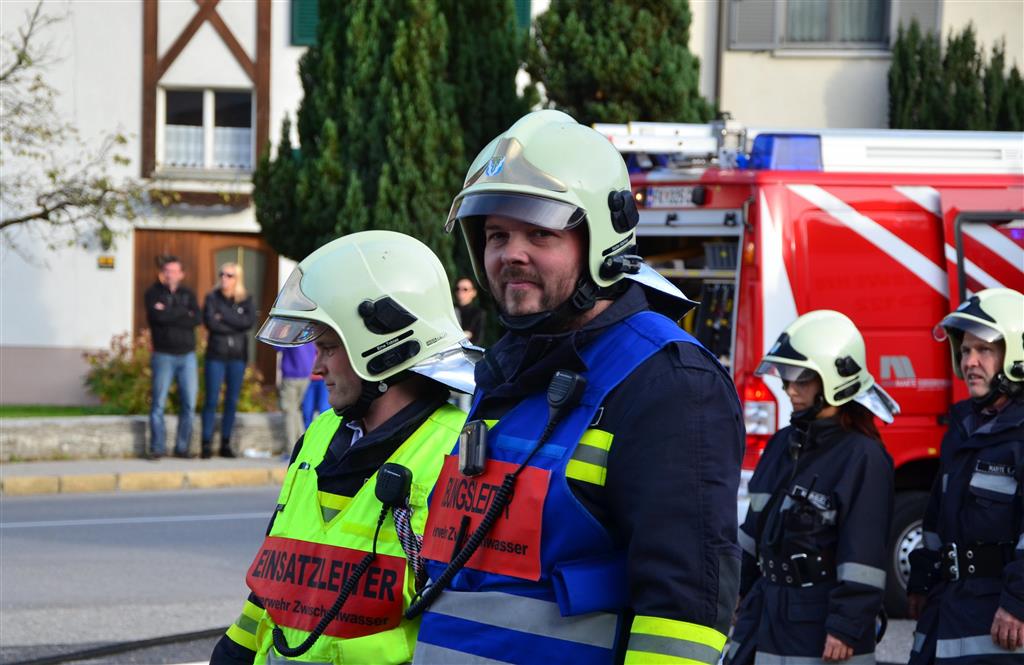 Kommandant Stefan Schnetzer erklärte den interessierten Bürgern den Probenablauf und die zahlreichen Tätigkeiten die durchgeführt wurden. Nachdem pünktlich um 16 Uhr der Übungsalarm auf dem Pager erschienen war, machten wir uns auf zum Übungsobjekt. Einsatzleiter Tobias Erne erkundete die Lage und teilte dann die einzelnen Mannschaften ein. Es galt mehrere Aufgaben zu lösen: