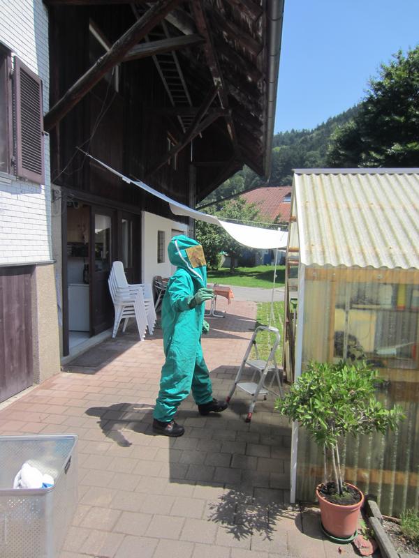 Situation: In einem Gewächshaus in der Hauptstraße in Muntlix, musste ein Wespennest entfernt werden. Geschützt durch den Insektenschutzanzug konnten zwei Kameraden das Wespennest sicher entfernen.