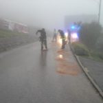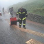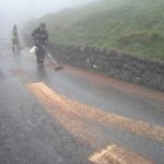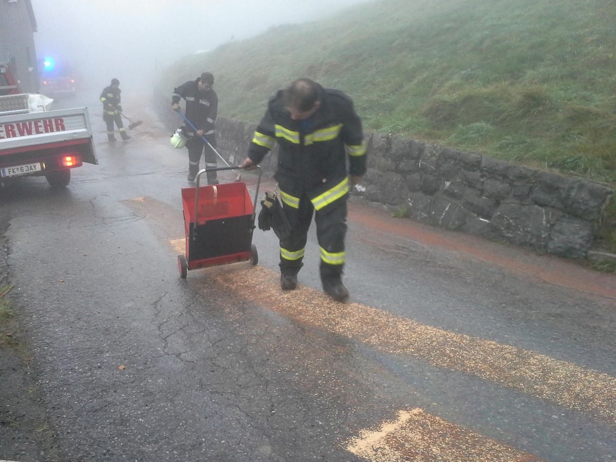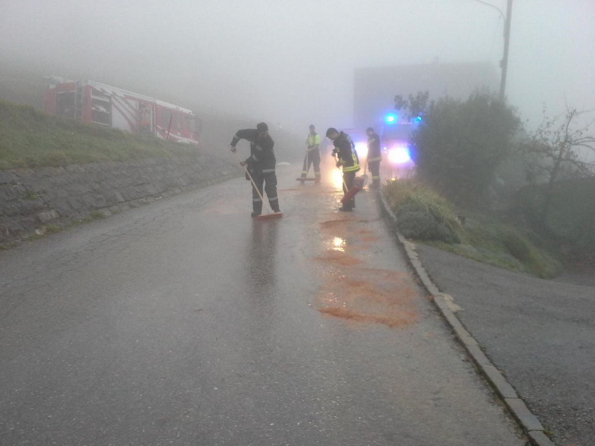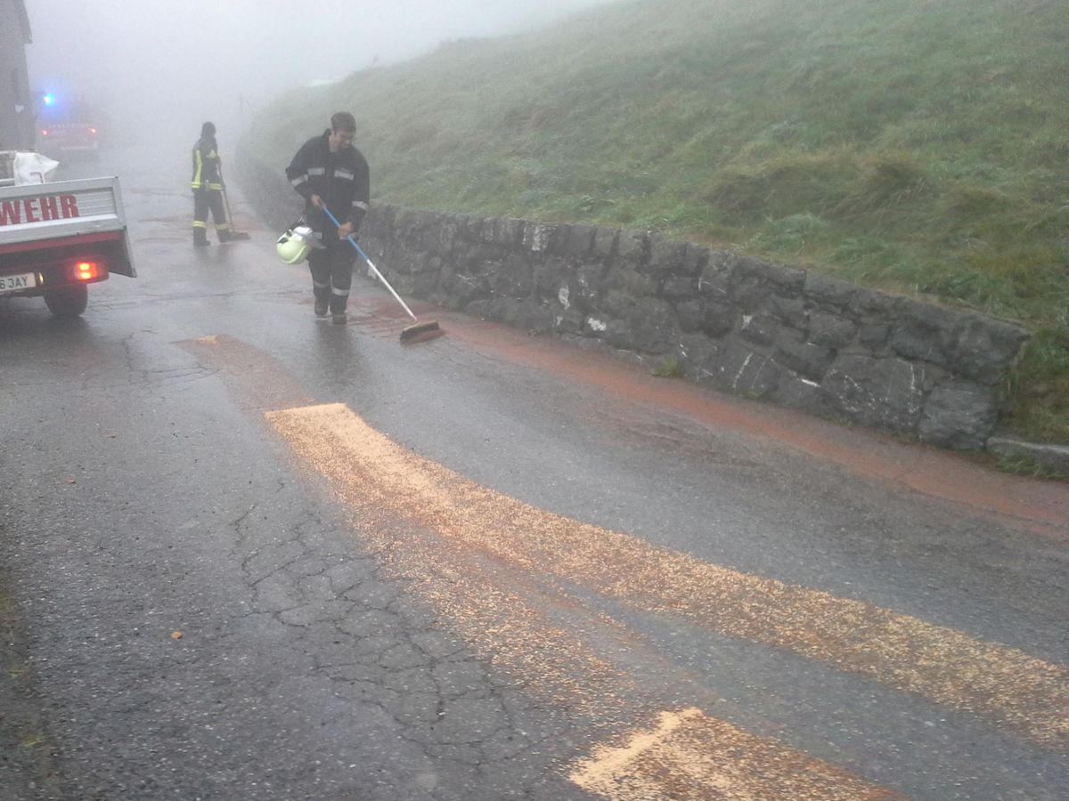 Situation: Ein LKW hatte am Dienstag Nachmittag eine längere Ölspur im Bereich Dafins Oberberg verursacht. Die ca. 500 Meter lange Ölspur, hatte sich aufgrund des Regens großflächig verteilt. Mit Hilfe von Bindemittel wurde das Öl gebunden und die Fahrbahn mit Besen und Schaufel gereinigt. Zudem wurde die Einsatzstelle mit den Warntafeln „Ölunfall“ gekennzeichnet.