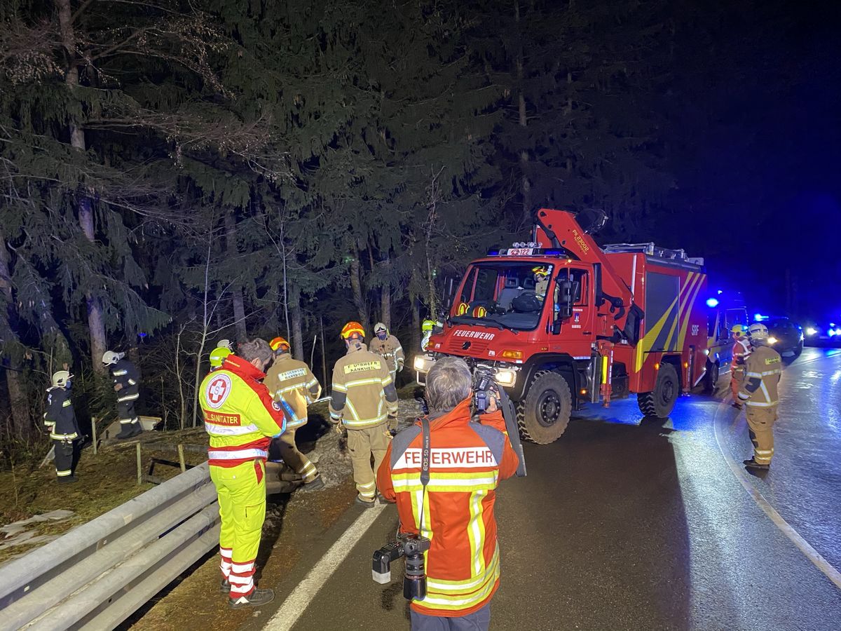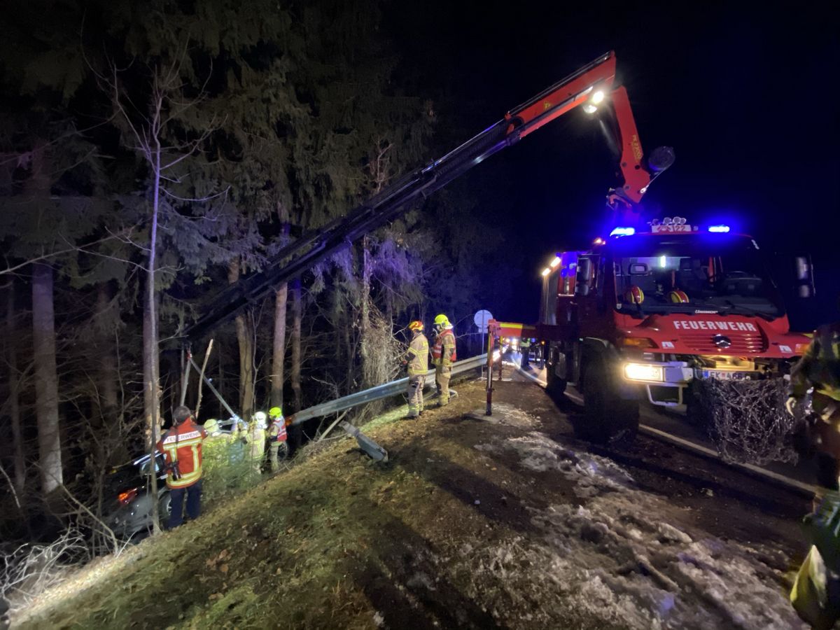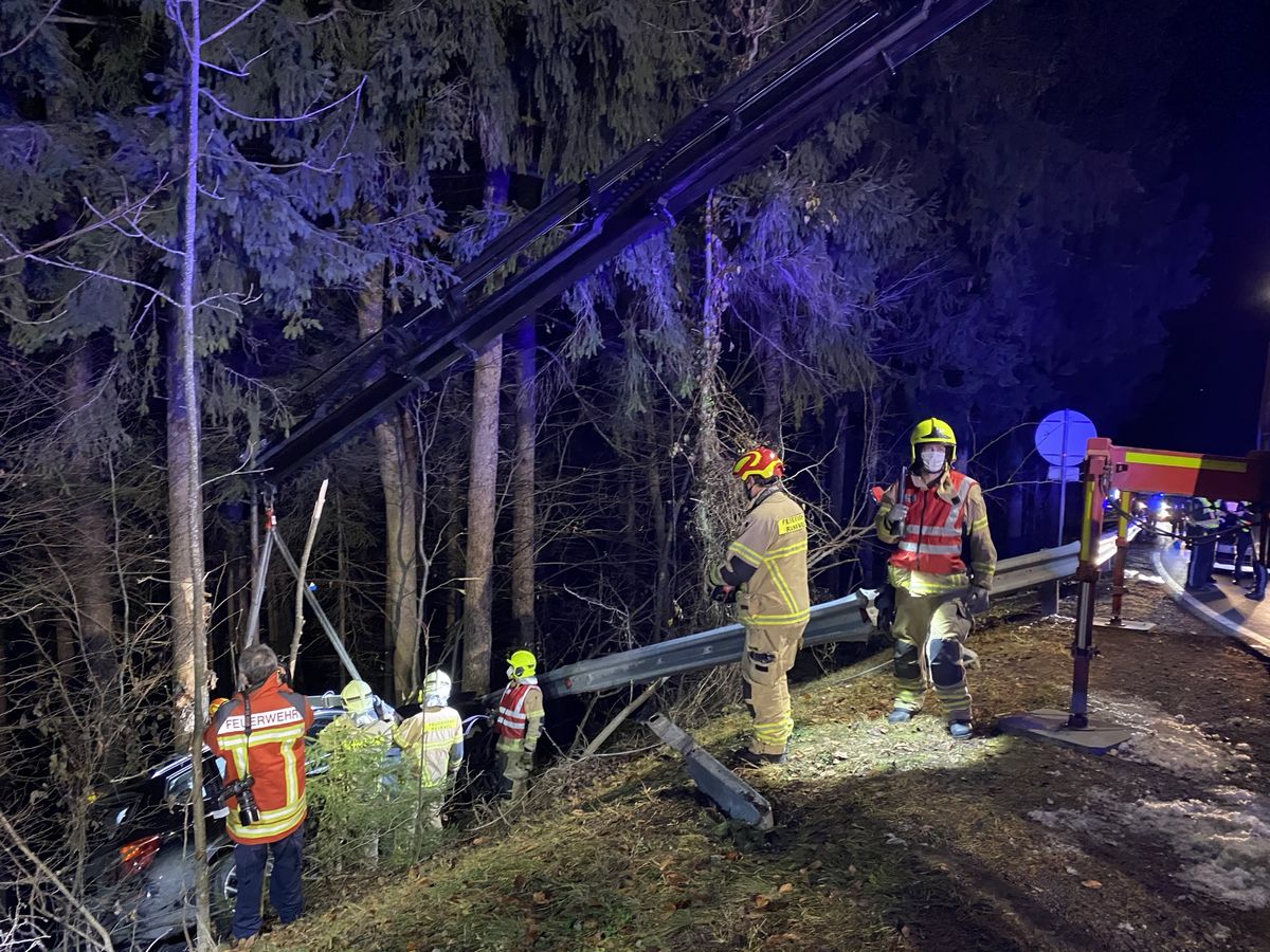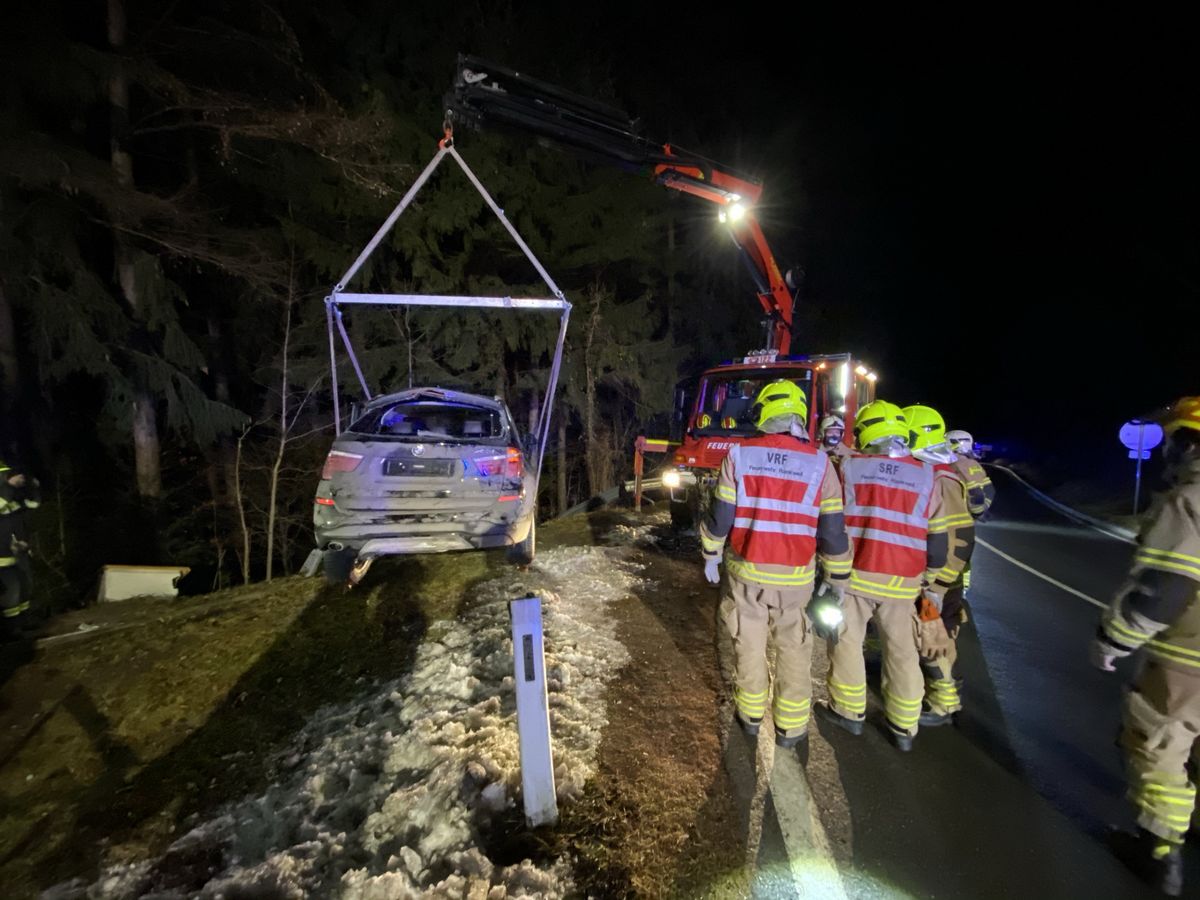 Situation: Kurz vor zwei Uhr, wurden wir zu einem Verkehrsunfall nach Batschuns alarmiert. Ein PKW, mit vier Personen besetzt, war auf der Laternserstraße talwärts unterwegs. In der Rechtskurve vor dem Ortseingang Batschuns, hatte das Fahrzeug die Leitschiene durchbrochen und war im steil abfallenden angrenzenden Wald in den Bäumen hängen geblieben. Bei unserem Eintreffen sicherten wir die Unfallstelle ab. Die vier Unfallbeteiligten wurden an den Rettungsdienst übergeben. Die Feuerwehr Rankweil war mit dem SRF (Schweres Rüstfahrzeug) Vorort. Nach Absprache mit der Polizei, konnte mit der Beregung des Fahrzeugs begonnen werden. Das Unfall Wrack wurde anschließend vom ÖAMTC abgeholt. Nachdem die Unfallstelle im Bereich der durchbrochenen Leitschiene mit Absperrband gesichert war, konnte der Einsatz gegen vier Uhr beendet werden.
