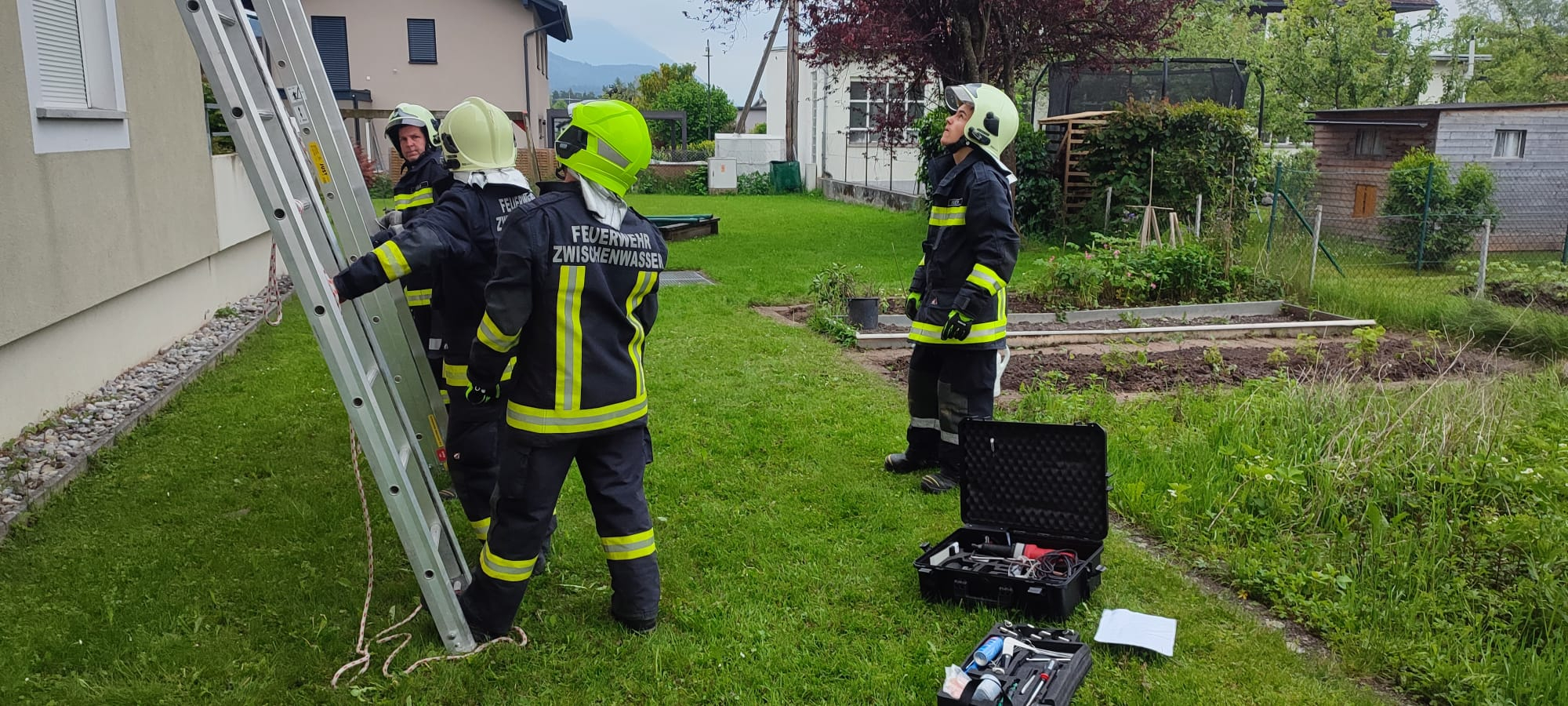 Situation: Bei diesem Einsatz hatte sich ein Kind im Zimmer eingesperrt und den Schlüssel abgezogen. Dieser ist dann aus unbekannter Ursache hinter einen Kasten gefallen. Die Polizei alarmierte die Feuerwehr zur Türöffnung. Am Einsatzort eingetroffen wurde mittels 2 Schiebeleitern zum Fenster des Zimmers im 2. OG aufgestiegen, Rollladen und Fenster in Zusammenarbeit mit dem Kind geöffnet, Einstieg durchs Fenster und Türe von innen geöffnet. So konnte der Einsatz nach wenigen Minuten erfolgreich abgeschlossen werden.