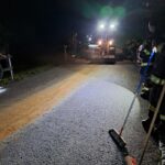 Situation: Am Abend des 9. August war bei einem Traktor ein Hydraulikschlauch geplatzt. Dadurch gelangte eine erhebliche Menge Öl auf die Fahrbahn. An der Einsatzstelle angekommen, wurde umgehend damit begonnen das Öl mit Bindemittel zu binden und die Fahrbahn mit Besen zu säubern. Zudem wurde die Fahrbahn mit maschineller Unterstützung gesäubert. Nachdem auch die Warntafeln „Öl-Unfall“ aufgestellt waren, konnte der Einsatz abgeschlossen werden.