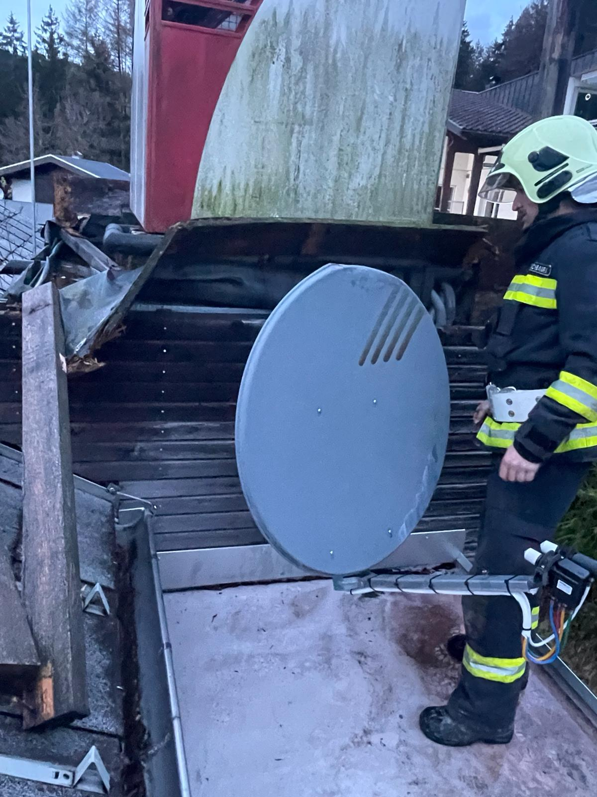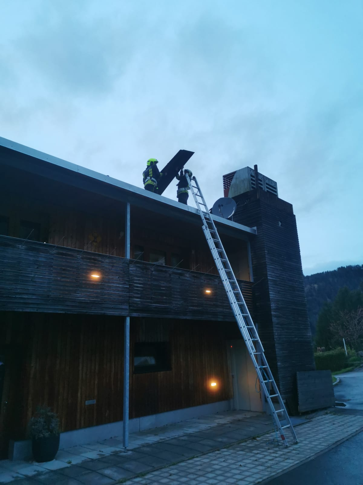 Situation: Am Abend des 1. April, wurden wir telefonisch zu einem Sturm-Schaden Einsatz in Dafins alarmiert. Fassadenteile hatte sich bei einem Gebäude durch den starken Wind gelöst und drohte nun abzustürzen. Die Kameraden Vorort, konnten über die zweiteilige-Schiebeleiter auf das Dach gelangen und so das Fassadenteil sichern und anschließend vom Dach auf den Boden schaffen. So konnte der Einsatz rasch abgewickelt werden.