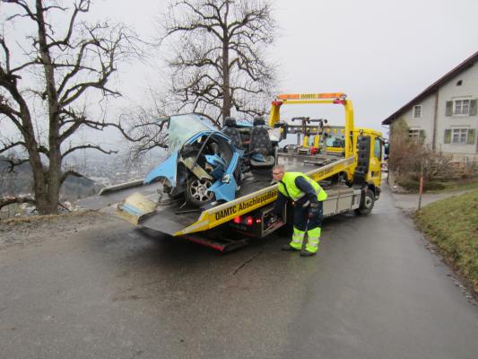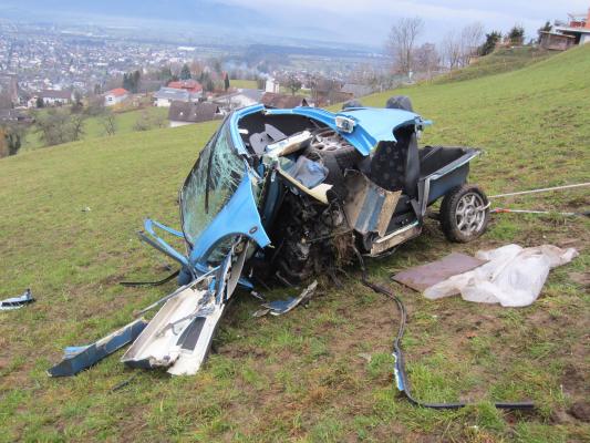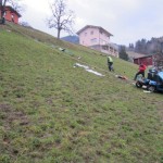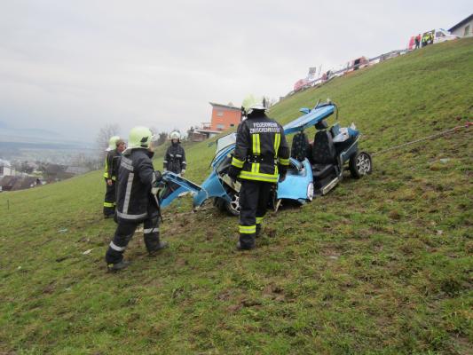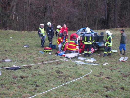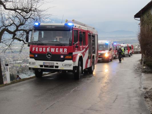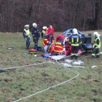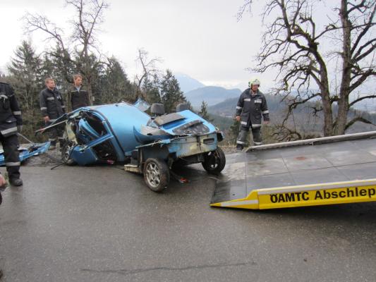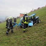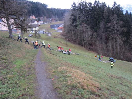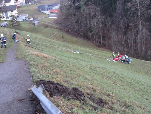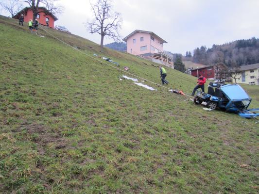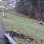 Situation: Am Montag Morgen fuhr ein Mann mit seinem Microcar von Laterns kommend auf der Laternserstraße in Richtung Batschuns. Auf Höhe Abzweigung Kirchstraße fuhr er aus bisher unbekannter Ursache über den Fahrbahnrand und stürzte ca. 30 m über steiles Gelände ab, wo er schließlich auf einer Wiese zu stehen kam. Der Fahrer wurde dabei unbestimmten Grades verletzt. Wir wurden zusammen mit der Rettung und der Polizei alarmiert. Beim Eintreffen konnte festgestellt werden das der Fahrer nicht eingeklemmt war und durch Ersthelfer betreut wurde. Unsere Aufgaben bestanden darin das Fahrzeug gegen weiteres Abrutschen zu sichern und gemeinsam mit der Rettung den Patienten mittels Rettungsschlittens zu retten. Nach dem der Fahrer versorgt und abtransportiert wurde, führten wir die Fahrzeugbergung mit Hilfe eines Traktors und einer Seilwinde durch. Der ÖAMTC transportierte das total zerstörte Fahrzeug ab. Nach kurzen Aufräumarbeiten konnten wir wieder einrücken.